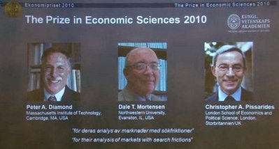 中新網(wǎng)10月11日電 據(jù)外電報道,瑞典皇家學(xué)院11日宣布,美國經(jīng)濟(jì)學(xué)家彼得·戴蒙德(Peter A. Diamond)、戴爾·默藤森(Dale T. Mortensen),塞浦路斯裔、英籍經(jīng)濟(jì)學(xué)家克里斯托弗·皮薩里德斯(Christopher A. Pissarides)三位學(xué)者共同獲得2010年諾貝爾經(jīng)濟(jì)學(xué)獎。