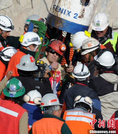 據(jù)報道,快到當?shù)貢r間13日上午9點時,現(xiàn)年56歲的喬治.加利古洛斯(Jorge Galleguillos)順利升井,成為智利圣何塞銅礦第11名被營救出來的被困礦工。