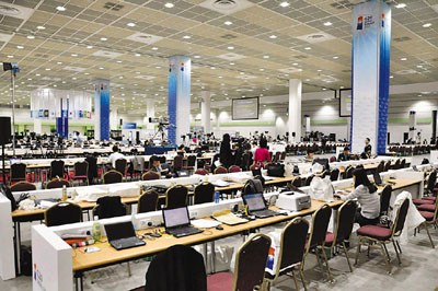 峰會會場COEX的新聞中心面積空前,主要分為電視和文字圖片記者兩個區(qū)域。工作人員表示,新聞中心設置1330個記者座位,另有132個電視轉播亭。