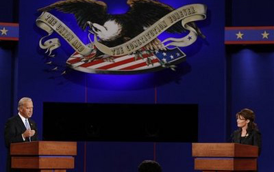 中新網(wǎng)10月3日電 綜合報(bào)道,當(dāng)?shù)貢r間2日晚,美國副總統(tǒng)候選人辯論在密蘇里州的華盛頓大學(xué)展開。共和黨副總統(tǒng)候選人佩林與民主黨副總統(tǒng)候選人拜登就伊拉克戰(zhàn)爭問題展開激烈辯論。