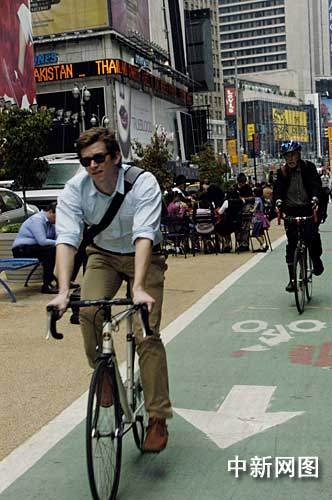 為了保護(hù)越來(lái)越多的騎車人,紐約這個(gè)對(duì)自行車“并不友善”的城市也開(kāi)始逐漸改變。今年以來(lái),紐約市交通局陸續(xù)在曼哈頓設(shè)置了很多防護(hù)欄,開(kāi)辟出自行車道。繁忙的百老匯大街上,一條綠色的自行車道,如護(hù)城河般把騎快車的人跟機(jī)動(dòng)車分開(kāi)了。