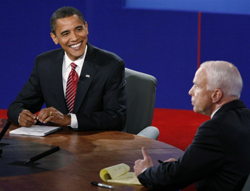 美國共和黨總統(tǒng)候選人麥凱恩和民主黨總統(tǒng)候選人奧巴馬在總統(tǒng)選舉投票前的最后一場電視辯論。(資料圖)