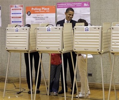 中新網(wǎng)11月4日電 據(jù)美聯(lián)社報道,民主黨總統(tǒng)候選人奧巴馬在其家人的陪伴下完成了在芝加哥選區(qū)投票的活動。他和其共和黨對手麥凱恩的總統(tǒng)選戰(zhàn)將是歷史性的。