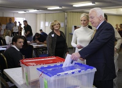 據(jù)報道,美國共和黨總統(tǒng)候選人麥凱恩4日在妻子辛迪的陪同下在亞利桑那州進行了投票。隨后麥凱恩計劃前往鄰近的科羅拉多州和新墨西哥州出席最后的競選拉票集會,當(dāng)日下午再返回鳳凰城等候選舉計票結(jié)果。