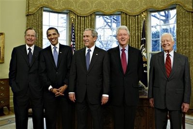 布什和奧巴馬講話后,五任總統(tǒng)站在美國(guó)總統(tǒng)橢圓辦公室合影,資格最老的卡特和老布什一左一右站在兩邊,每個(gè)人都露出了紳士的笑容。