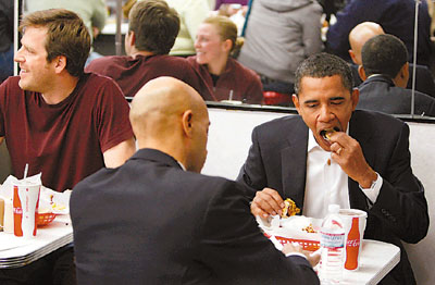 經(jīng)過一輪哄動(dòng),奧巴馬亦無忘記此行目的,向職員詢問:“食物在哪?”引起全場大笑。最后他與芬蒂點(diǎn)了辣味熱狗及炸芝士條。奧巴馬在進(jìn)食期間與其他客人交談,又向侍應(yīng)索取芝士條調(diào)味。