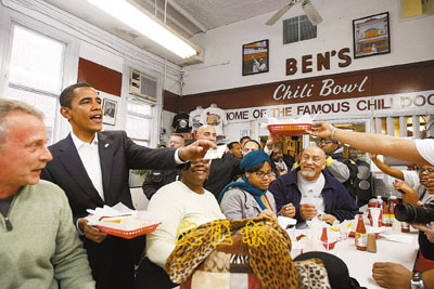 前天奧巴馬與華盛頓市長芬蒂,到當(dāng)?shù)厥兄行囊婚g著名的熱狗快餐店進(jìn)餐。由于正值午餐時(shí)間,店內(nèi)大批顧客見到奧巴馬大駕光臨,無不歡喜尖叫。奧巴馬向顧客打招呼并拍照留念,又抱起一名嬰兒,盡顯親民一面。