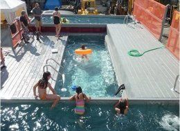 據(jù)臺灣《中國時(shí)報(bào)》報(bào)道,這座游泳池位在紐約市布魯克林區(qū)歌瓦努斯運(yùn)河河畔,共有三個(gè)池子,全是由垃圾收集箱改造而成,泳池旁邊有一片平臺,放著幾張海灘椅和烤肉架,還附設(shè)一個(gè)淋浴間。從7月4日開幕以來,已經(jīng)舉辦過烤肉、電影試映和攝影等活動(dòng),許多紐約藝文界人士趨之若鶩。