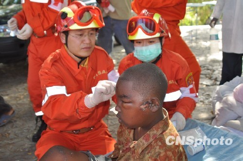 海地當(dāng)?shù)貢r間14日9時,中國武警總醫(yī)院赴海地國際救援醫(yī)療分隊開設(shè)第一個流動醫(yī)療點,已為110名受傷的災(zāi)民提供醫(yī)療救助。海地總理禮賓官趕到醫(yī)療救助點,他握著來自中國武警總醫(yī)院的醫(yī)生的手說:“感謝中國國際救援隊,你們是第一支來總理府進行人道主義救助的救援隊”。