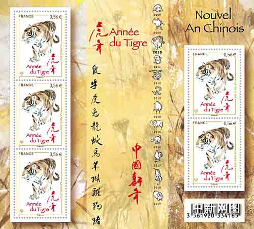 這是繼發(fā)行雞年、狗年、豬年、鼠年和牛年紀(jì)念郵票之后,法國(guó)第6次發(fā)行中國(guó)農(nóng)歷生肖紀(jì)念郵票。