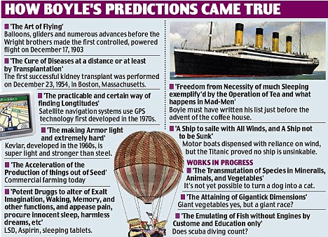 在博伊爾的榜單中包含了在他那個年代看似怪異的想象,包括夜幕中的航空旅行和止痛藥物的發(fā)現(xiàn)。