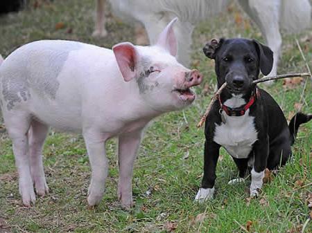 據(jù)臺(tái)灣東森新聞網(wǎng)報(bào)道,英國一動(dòng)物庇護(hù)站人員表示,小豬剛被收養(yǎng)時(shí),因?yàn)槿菀咨。跃桶阉硼B(yǎng)在房子周圍,以方便觀察病情。沒想到它很快就與周圍的小狗打成一片。小豬剛進(jìn)來的時(shí)候體型只有小狗的一半,5周后就比小狗大上了2倍。