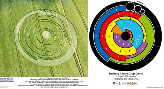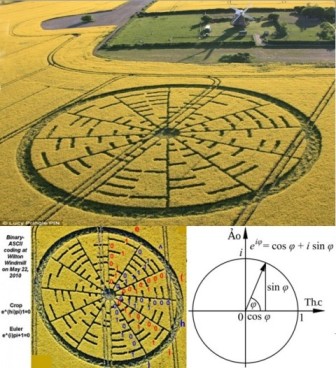 然而,有些麥田怪圈的圖案復(fù)雜性驚人。著名麥田怪圈女學者露西.普林格爾強烈懷疑,穆爾伯勒市的麥田怪圈象征著二進制之類的數(shù)系,數(shù)學家指出,由圓心向外去看,這個圖案呈現(xiàn)著由瑞士數(shù)學家萊昂哈德-歐拉被視為“最美麗的數(shù)學定理之一”的e^(i)p+1=0。