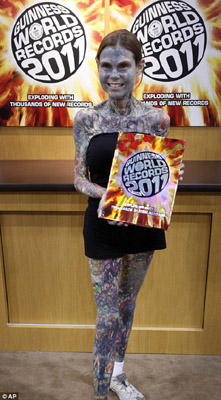 中新網(wǎng)5月27日電 據(jù)英國(guó)媒體報(bào)道,美國(guó)女孩希努斯(Julia Gnuse)全身95%都覆蓋著五顏六色的紋身。她也被吉尼斯世界紀(jì)錄評(píng)為世界上紋身最多的女人。5月26日,她出席了紐約圖書博覽會(huì),也展示了自己身上的紋身。