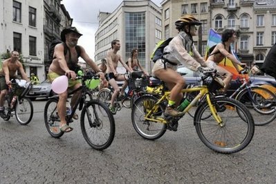 據(jù)報道,大約50名沒穿褲子、赤身裸體的比利時人在首都布魯塞爾市組成隊伍,騎著自行車游行。雖然當天風雨交加,“勇士”們的熱情卻沒有輕易被澆滅。