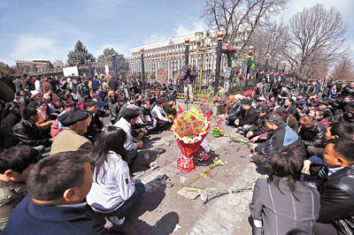 吉爾吉斯民眾在首都比什凱克市中心的總統(tǒng)府前敬獻(xiàn)鮮花,悼念76名遇難者。