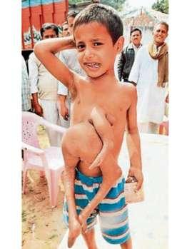 據(jù)德國《圖片報》2月19日報道,現(xiàn)年8歲的迪帕克·庫馬爾是一名來自印度比哈爾邦的小男孩。從一出生,他的外貌就把周圍的人驚得目瞪口呆:他長著4條腿和3支手臂,在他腹中有個孿生弟弟和他一起來到這個世界上。