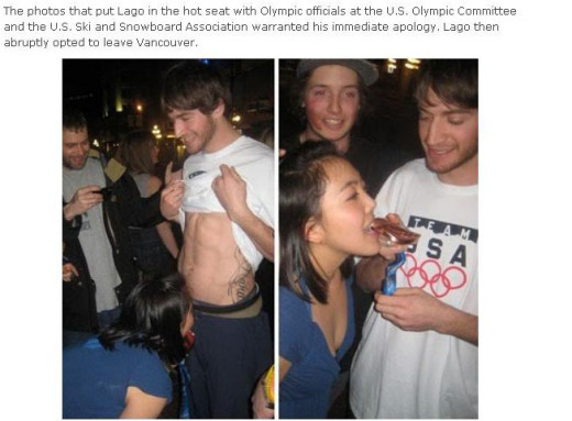 日前,一些關于拉戈在比賽后慶祝勝利盡情放松的照片在互聯網上流傳。從照片上看,拉戈與朋友們的慶祝方式極為不雅,他因此被斥為美國隊的恥辱。照片中,拉戈在溫哥華市內的一處房屋內,身著美國隊訓練服,佩戴著剛剛獲得的銅牌,而一名不知名的女子在他的腰部左右的位置親吻拉戈的獎牌。
