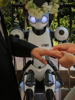 據(jù)報道,16日,一對日本新人在東京日比谷公園(Hibiya Park)一間餐館的開放式屋頂上共結連理,面對50多名賓客主持婚禮的,不是人類,而是一款名為“I-Fairy”(小精靈)的“美女”機器人。