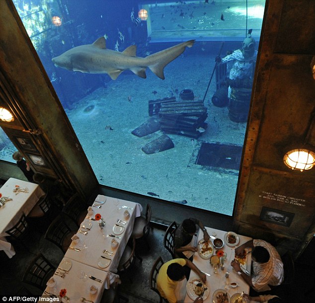 當(dāng)你在船尾這家涼爽昏暗的角落,大嚼著生猛海鮮,這家海洋樂(lè)園著名的鯊魚,會(huì)從你就餐的窗戶外遨游而過(guò)。