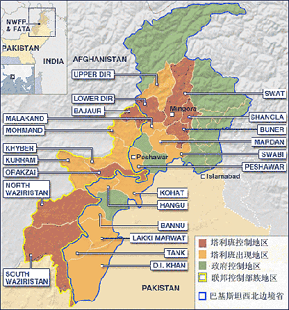 中新網(wǎng)5月14日電 由BBC所制作的一份關(guān)于巴基斯坦西北邊境省份的地圖顯示該省只有38%以及周圍的地區(qū)掌握在政府的控制之下。