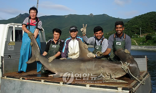 韓國國立水產(chǎn)科學院資源研究科博士金正年(音)表示:“錘頭雙髻鯊和大白鯊非常兇猛。最近在釜山共同海鮮市場經(jīng)常能夠見到賣鯊魚的攤位!薄半S著周邊海域海水變暖,鯊魚出沒現(xiàn)象往后還會日益頻繁!