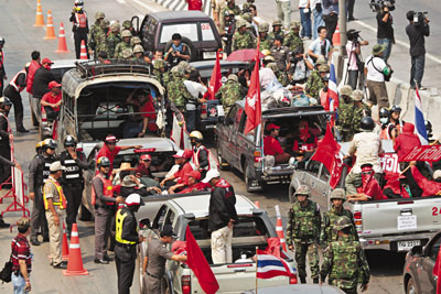 泰國政府原規(guī)定不準外府紅衫軍駕車入城,以免造成交通堵塞,但紅衫軍拒絕了政府軍警安保人員的要求,軍警為避免和示威者發(fā)生對抗,最后讓紅衫軍一路開車長驅(qū)直入曼谷市區(qū)。