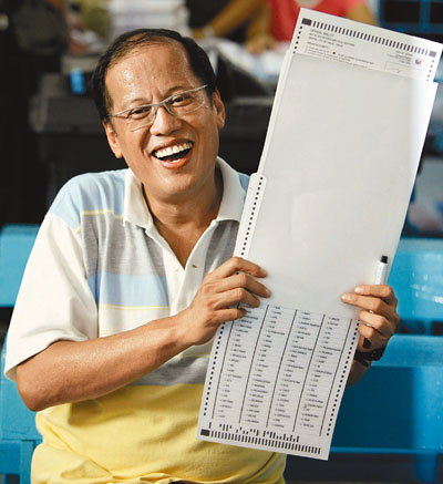 中新網(wǎng)5月11日電 據(jù)香港《文匯報》報道,菲律賓10日大選,選舉委員會表示,在已點算的57%選票中,已故前總統(tǒng)阿基諾夫人的兒子阿基諾三世取得40.58%選票,其勁敵73歲前總統(tǒng)埃斯特拉達只得25.72%。阿基諾三世有望繼亡母后,成為家族中第2名總統(tǒng),他承諾當(dāng)選后致力打擊腐敗和消除貧困。