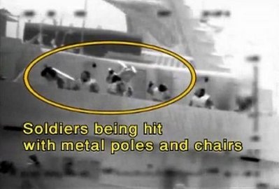 以軍發(fā)布長(zhǎng)1分鐘的紅外線錄影片段,并配上英文字幕上載至YouTube網(wǎng)站。片段可見(jiàn),當(dāng)首名士兵從直升機(jī)游繩而下,甫踏足土耳其救援船“馬維.馬爾馬拉號(hào)”甲板之際,一名船員便向他投擲閃光彈,甲板上的人紛找掩護(hù)或伏在地上。這時(shí)候,有船員抓住以軍的繩子搖晃,一名士兵似脫手掉下。他們又把繩子縛在甲板,企圖扯下直升機(jī)。降落甲板計(jì)程車(chē)兵遭佩戴防毒面具的船員攻擊。字幕稱(chēng):“士兵遭人以金屬棒和椅子毆打。”船員又企圖搶奪士兵的武器,一名士兵更被多名船員合力抓住雙腿,從甲板拋下!