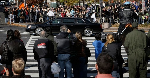 奧巴馬乘坐的豪華轎車(chē)駛過(guò)街頭,邊上是圍觀歡迎的人群