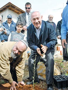 在黨內(nèi)鷹派人物班尼·貝京、前以色列總參謀長(zhǎng)摩西·亞阿隆以及戈蘭高地當(dāng)?shù)鼐用癜啤ひ了返呐阃,?nèi)塔尼亞胡親手栽下兩棵桉樹苗,發(fā)誓永遠(yuǎn)不會(huì)將這塊土地拱手相讓。內(nèi)塔尼亞胡還帶著兒子阿費(fèi)納,他發(fā)誓稱,阿費(fèi)納的子子孫孫會(huì)一直坐在這棵樹下。