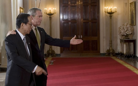 在兩個(gè)人都很為難的時(shí)候,福田明白,他這次如果再要求布什把“綁架日本人問(wèn)題”與美朝關(guān)系捆綁在一起,就是大大地“不識(shí)相了”。布什也是心領(lǐng)神會(huì),只不過(guò)面對(duì)記者,慷慨激昂地表示了一下“我們不會(huì)忘記‘綁架被害者家屬’”,而不作任何實(shí)質(zhì)性承諾。