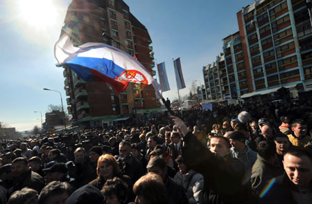 19日中午,幾千名塞族學(xué)生在大橋北岸游行,塞爾維亞國(guó)旗迎風(fēng)飄舞。游行是在12點(diǎn)44分開始的,寓意是聯(lián)合國(guó)安理會(huì)第1244號(hào)決議。該決議重申南聯(lián)盟(主權(quán)地位后為塞爾維亞繼承)對(duì)科索沃地區(qū)擁有主權(quán)。