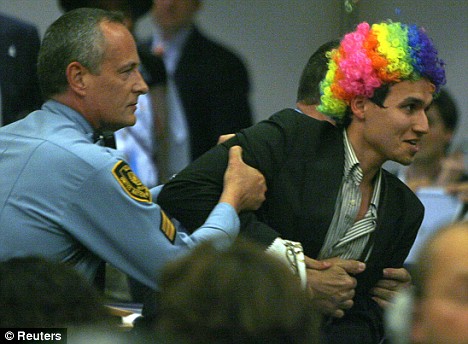 內(nèi)賈德講演時(shí)遭到小丑示威者投擲假鼻子(組圖)