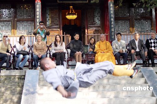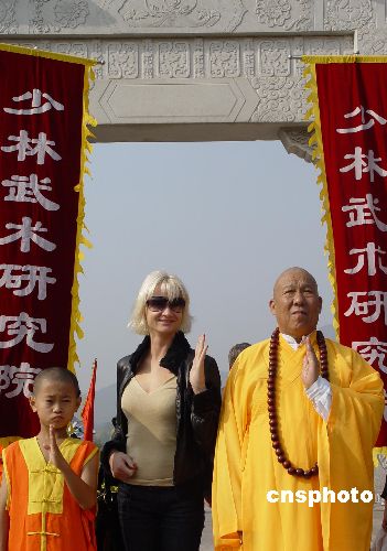 十月二十五日,俄羅斯美女體操明星霍爾金娜造訪嵩山少林寺。當日,以俄羅斯國家杜馬體育、運動和青年事務委員會副主席、中俄友好、和平與發(fā)展委員會俄方青年工作分委會副主席亞歷山德拉·布拉塔耶娃為團長的俄羅斯奧運冠軍代表團一行訪問嵩山少林寺。據(jù)悉,俄羅斯奧運冠軍代表團此次來訪是全國青聯(lián)為配合北京奧運會舉辦的體育交流項目,也是二00七年中俄友好、和平與發(fā)展委員會中俄雙方青年工作分委會框架內(nèi)重點交流活動之一。中新社發(fā) 李志全 攝