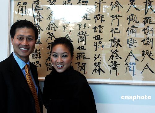 圖為關(guān)穎珊和華美銀行董事長(zhǎng)兼總裁吳建民一起,欣賞中國(guó)當(dāng)代藝術(shù)家徐冰將英文歌詞用中文正楷獨(dú)特書法表現(xiàn)的《巴布狄倫的脫變時(shí)節(jié)》。