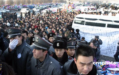 1月7日上午,烏魯木齊市燕兒窩殯儀館,萬(wàn)余名烏魯木齊市民悼念在“1.2”火災(zāi)中犧牲的消防戰(zhàn)士朱曉雷、張宇、高峰3位烈士。朱曉雷、張宇、高峰的英雄事跡在社會(huì)上引起強(qiáng)烈反響,新疆各族群眾自發(fā)前往吊唁。自治區(qū)人民政府追授三位烈士為“模范消防衛(wèi)士”,公安部批準(zhǔn)他們?yōu)楦锩沂,自治區(qū)團(tuán)委追授三位烈士“新疆青年五四獎(jiǎng)?wù)隆,自治區(qū)公安廳授予三位烈士“優(yōu)秀共產(chǎn)黨員”榮譽(yù)稱(chēng)號(hào)。中新社發(fā) 李雄心 攝