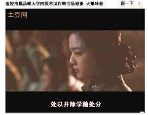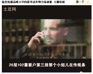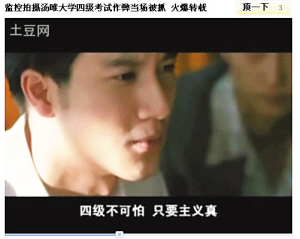 視頻的高潮出現(xiàn)在校方采取的反作弊行動,畫面切換成《無間道1》中黃秋生部署抓琛哥,臺詞卻換成:“這次四級考試,梁校長下令狠抓作弊,所以我們采用高科技無線遠程監(jiān)考,考試的時候,大家用望遠鏡遠距離瞅著考場,一旦發(fā)現(xiàn)作弊的,立馬用手機報告抓捕大隊,一個活口不留!辈⒓尤肼(lián)通廣告元素。接下來,《越獄》里的林肯“奉命”拿著望遠鏡報告:“26層102窗戶第三排那個小妞在傳紙條!薄缎略鷰熋谩防锏姆街蠸ir接獲報告后立馬拿著呼叫器大叫:“好,我們立馬去逮。”最后,王佳芝和鄺裕民雙手被縛,跪在石礦場上,這時配上校方用無比嚴(yán)肅口吻說出的“宣判詞”:“王佳芝等同學(xué)作弊,違背了天天學(xué)習(xí),好好向上的校訓(xùn),現(xiàn)處以開除學(xué)籍處分!