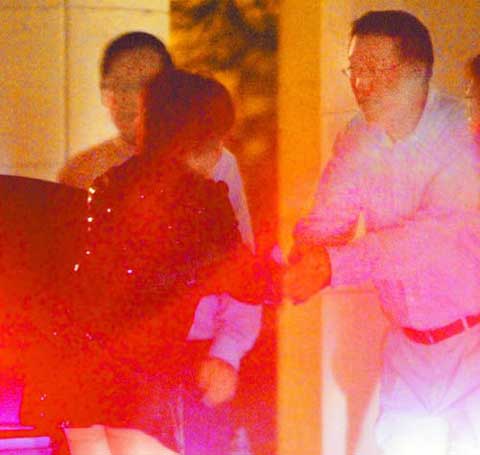 餐后郭臺(tái)強(qiáng)(右)特地送劉曉慶(左)上車,2人握手告別。