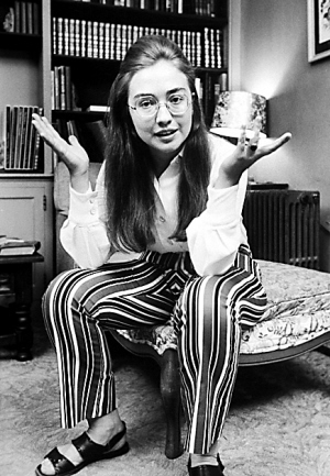 在上世紀(jì)60年代,希拉里仍是年輕大學(xué)生時,卻留了一頭禾稈草般的厚重長發(fā),加上一雙土土的涼鞋,令她看上去像一位大嬸,而且她又穿了一條夸張的“豎條長褲”,感覺像滑稽小丑,爆笑效果一流。對于這張“經(jīng)典倩影”,希拉里依然力撐到底:“這不是我的錯!60年代流行這一套!”