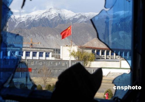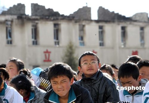 3月21日,拉薩二中的中學(xué)生在被焚毀的教室前集會控訴不法分子罪行。