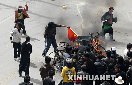 3月14日,一群不法分子在西藏自治區(qū)首府拉薩市區(qū)的主要路段實(shí)施打砸搶燒,焚燒過往車輛,追打過路群眾,沖擊商場(chǎng)、電信營(yíng)業(yè)網(wǎng)點(diǎn)和政府機(jī)關(guān),給當(dāng)?shù)厝嗣袢罕娚?cái)產(chǎn)造成重大損失,使當(dāng)?shù)氐纳鐣?huì)秩序受到了嚴(yán)重破壞。事后查明,這天,不法分子縱火300余處,拉薩908戶商鋪、7所學(xué)校、120間民房、5座醫(yī)院受損,砸毀金融網(wǎng)點(diǎn)10個(gè),至少20處建筑物被燒成廢墟,84輛汽車被毀。有18名無辜群眾被燒死或砍死,受傷群眾達(dá)382人,其中重傷58人。拉薩市直接財(cái)產(chǎn)損失達(dá)24468.789萬元。