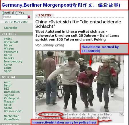 類似的“張冠李戴”還有不少。德國《柏林晨報(bào)》網(wǎng)站18日將一張西藏公安武警解救被襲漢族人的照片硬說成是在抓捕藏人;美國?怂闺娨暸_網(wǎng)站刊登圖片稱,中國軍人將藏人抗議者拉上卡車,可圖片中明明是印度警察。德國NTV電視臺也在報(bào)道中將尼泊爾警察抓捕藏人抗議者說成是“發(fā)生在西藏的新事件”。