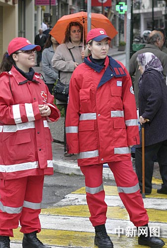 3月27日,北京奧運(yùn)圣火希臘境內(nèi)傳遞第四天,山城納烏薩迎來(lái)第一個(gè)慶典儀式。身穿紅制服的醫(yī)護(hù)人員在慶典儀式現(xiàn)場(chǎng)。中新社記者:王歡