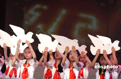 2008年5月19日,河南電視臺(tái)都市頻道舉行賑災(zāi)捐款晚會(huì),來自鄭州多所學(xué)校的小學(xué)生手舉“和平鴿”為四川地震災(zāi)區(qū)人民祈福。