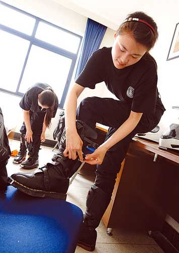 李亞麗穩(wěn)穩(wěn)當(dāng)當(dāng)?shù)伛{著摩托車圍著場地繞了一圈。那些從沒開過摩托車的姐妹們可就沒那么穩(wěn)當(dāng)了。25歲的“警花”甄珍,1米74的個頭,曾在警官樂團擔(dān)任打擊樂聲部長,隨團出訪日本參加世界警察音樂會。2002年從警校畢業(yè)后分配到車管所工作。性格開朗的她平時喜歡健身、看書、聽音樂。這次被調(diào)入帶路隊,心里甭提多高興了,“騎著摩托車、頭戴耳麥式頭盔、腳蹬馬靴、全身披掛著直接為奧運會服務(wù),甭提多威武了。”可當(dāng)她和女隊員們看到眼前這些自重都在500斤以上的大排量摩托車時,卻傻了眼兒。這哪是摩托車呀,簡直是條船。