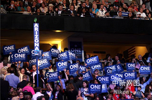 Jim Leach作為共和黨員也上臺為奧巴馬發(fā)表演講,臺下觀眾紛紛拿出“同一個國家”的標語表示支持。馬婧 攝