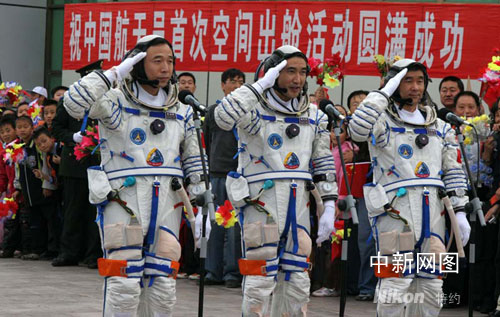 北京時間二十五日下午五時三十五分許,“神七”航天員乘組在中國酒泉衛(wèi)星發(fā)射中心航天公寓“問天閣”廣場舉行出征儀式,身穿乳白色艙內(nèi)航天服的“神七”三名航天員翟志剛、劉伯明、景海鵬受命出征太空。孫自法 攝