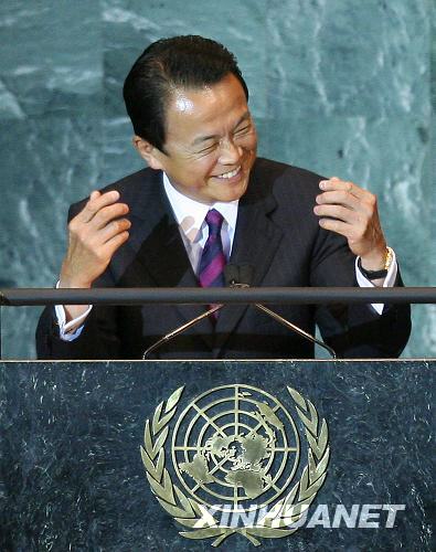 9月25日,在美國紐約聯(lián)合國總部,參加聯(lián)大一般性辯論的日本首相麻生太郎用日語講了幾分鐘后得知大會(huì)的日語翻譯未就位,臺下代表聽不懂他說什么時(shí)不禁有些尷尬地啞然失笑。當(dāng)日,第63屆聯(lián)大一般性辯論進(jìn)入第三天。新華社記者 侯俊 攝