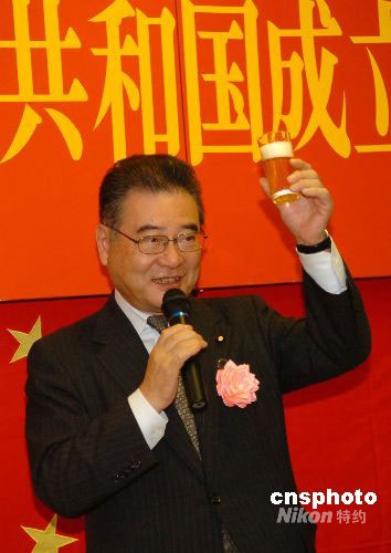 日中友好協(xié)會(huì)新任會(huì)長(zhǎng)、自民黨原干事長(zhǎng)加藤紘一舉杯祝愿中日兩國(guó)世代友好。